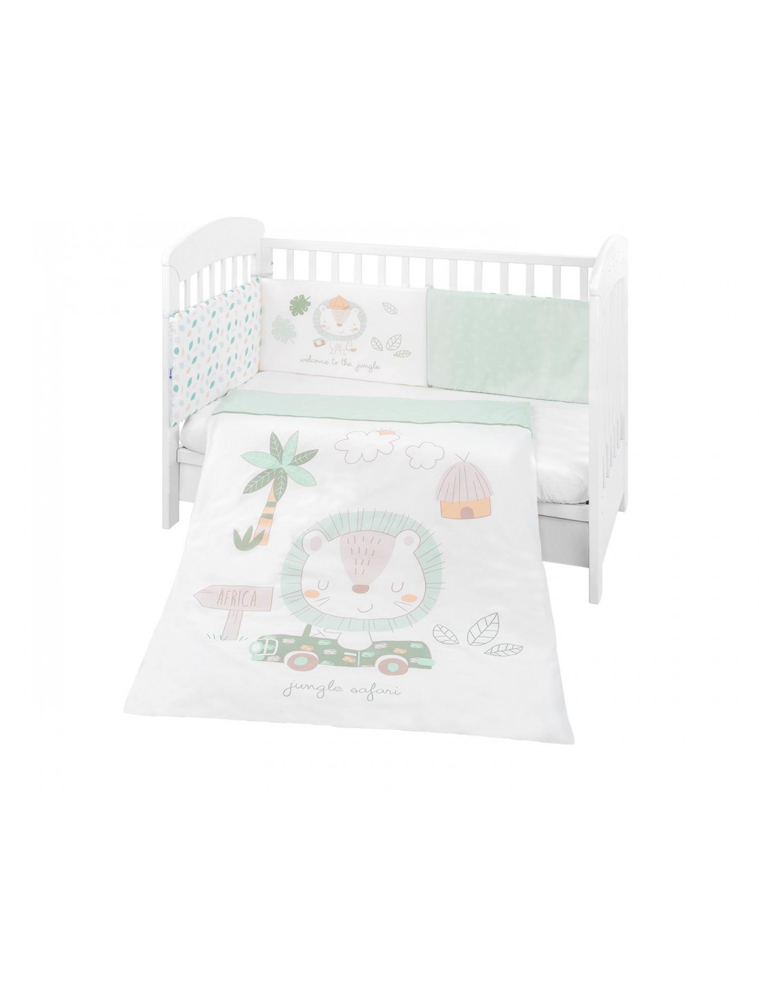 Funda nórdica con cremallera 95x135 cm de algodón 100%; - Edredón suave y cálido de 95x135 cm confeccionado en guata de poliéster esponjosa y tejido sin tejer; - Semi parachoques de cama de 35x210 cm compuesto por funda extraíble con cremallera y 3 piezas de relleno de espuma suave de 35x70 cm recubiertas de tela no tejida; • Viene en una bolsa de almacenamiento resistente al polvo; • Fabricado en la UE.